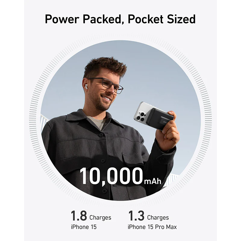 Compact and Powerful: The 10,000mAh small-sized battery contains enough power to charge an iPhone 13 Pro 1.8 times*.