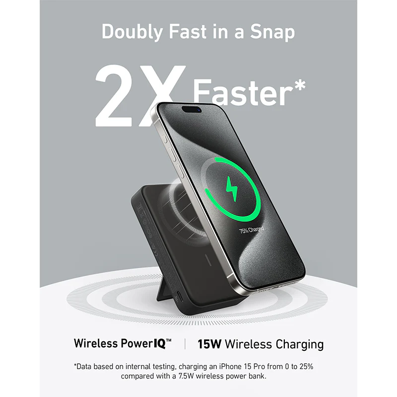 This charger in its small form packs a punch, it can charge an iPhone 15 1.8 times! Capacity: 10,000mAh Compatibility: iPhone generations 12, 13, 14, and 15 Series 2 in 1 Functionality: Acts as both a portable battery and a colorful, fashionable magnetic wireless charger. Features a FAST charging port. Phone Stand Feature: The stand can fold up to serve as a phone stand while wirelessly charging. Powerful Battery: The 10,000mAh battery provides sufficient power to charge the iPhone 15 Pro 1.8 times. High-Speed Charging: Maximum input and output of 20W. Charges iPhone 15 eight times faster than regular 5W chargers. Self-recharging takes just 1.8 hours. Magnetic Wireless Charging: Strong magnetic connection securely holds the phone in place. Charger attaches to the back of the phone for continuous power. Technical Specifications: Dimensions: 107.3 x 69.5 x 20.5mm Weight: 208g USB-C